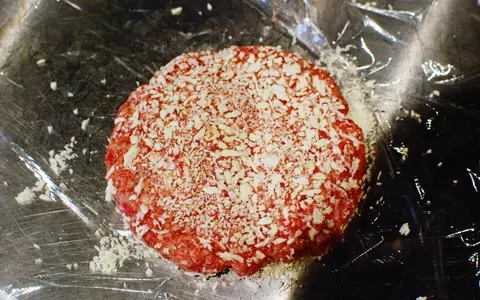 2.1を、バンズのひとまわり大きくなるくらいの平たい丸になるよう整える。両面にパン粉をまぶしつける。
