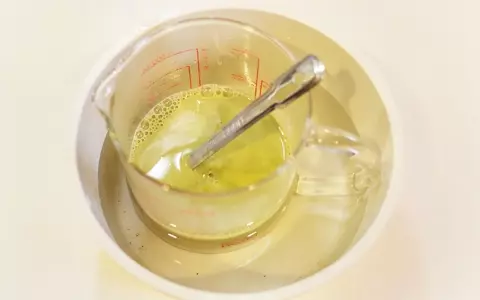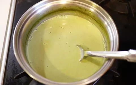 4. 冷水や氷水を底にあてて、混ぜながらよく冷やします。冷蔵庫に入れて時折取り出して混ぜる方法でもOK。全体的にとろっとしたトロミがつくまで冷やします。(予め冷やしてから注ぐことで、抹茶の沈殿を防ぐことができます)