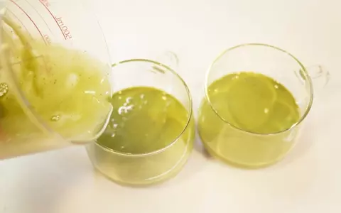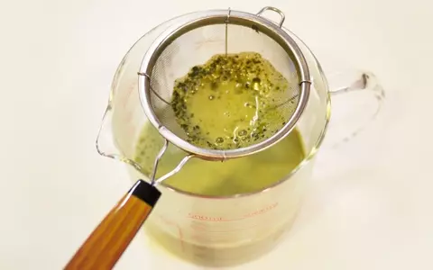 3. プリンの器に注ぎやすい容器を別に用意します。材料がよく溶けたら、茶こし網などでこしながら液を移します。
