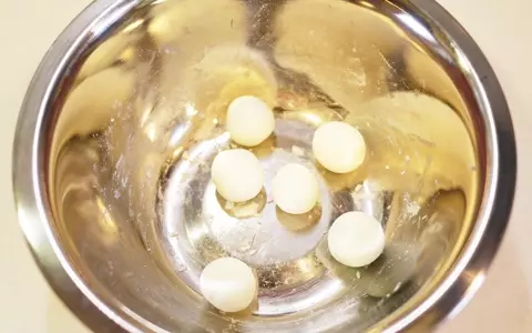 6. プリンを冷やしている間に、白玉を作ります。鍋にお湯を沸かしている間に、粉と水を混ぜて団子を作ります。耳たぶより少し硬いくらいの生地になるように練ります。水分が足りないと感じた場合は少し足してください。6等分にだいたい分けて、手のひらでコロコロと丸めます。