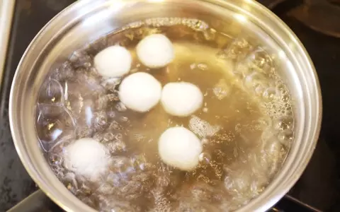 7. 鍋のお湯が沸騰したら、白玉を入れて茹でます。白玉が浮き上がってきてから1~2分後が茹で上がりの目安です。茹で終わったら冷水にとり、水でしめます。