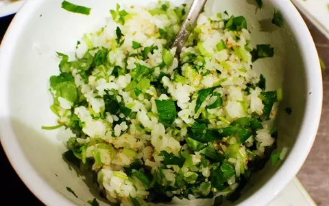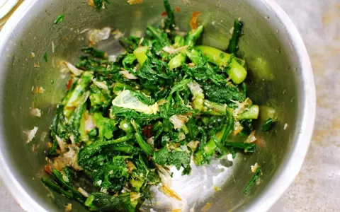2. 春菊は沸騰したお湯で軸のほうから先に茹で、1分半ほど茹でて冷水にいれ、手でぎゅっと水気を絞って2cm幅に切る。ボウルに入れ、☆でよく和えたら、最後に鰹節を適量入れてざっと和える。