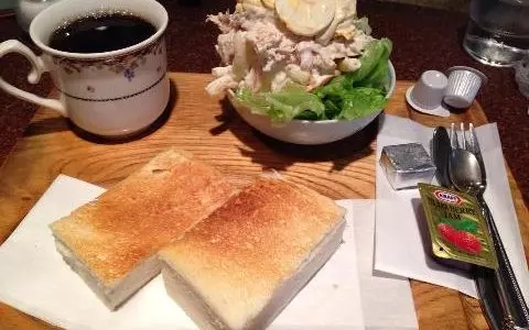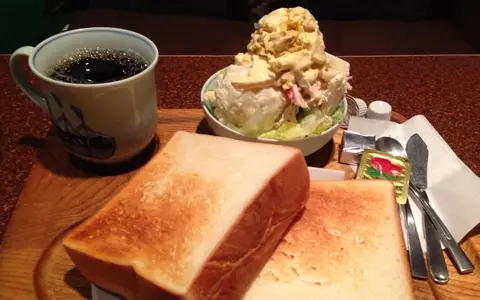 この画像から伝わりきるかどうかわからないが、食パンはこの2枚で1/2斤はあるだろうという分厚さ。マーガリンとイチゴジャムの2種類がついてくる。コーヒーもミルクが2つ付いてくるあたり、通常のカップ2杯分ほどたっぷり入っている。