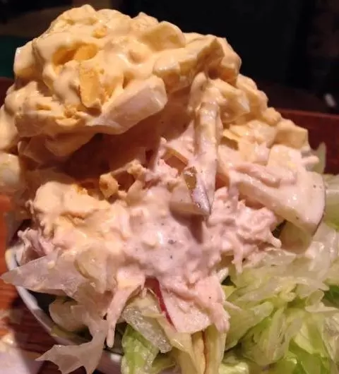 ドレッシングのかかったレタスの上に、マカロニサラダ、林檎入りツナサラダ、じゃがいもがゴロゴロ入ったポテトサラダ、さらに一番上には、粗めにつぶしたゆで卵のタマゴサラダという4層構造。小さなフォークでこぼさないように食べるだけでも大変だ。