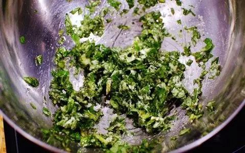 3.バジルは包丁で粗みじん切りにする。ボウルにバジルと★を入れよく混ぜる。