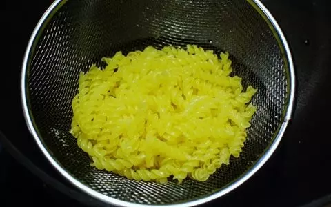 4.早茹でパスタは、塩を適量入れた湯で、袋の表時間通りに茹でる。