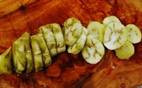 2.真っ黒になったら熱いうちに皮を剥き、2cm幅に切っておく。