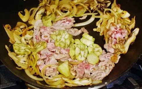 3.フライパンに★を入れ弱火にかけ、香りがたったら玉ねぎを入れ、中火にして炒める。玉ねぎが透き通ってきたら舞茸をいれ、さらに牛肉を入れて、塩を全体に少々し、酒を回しいれる。