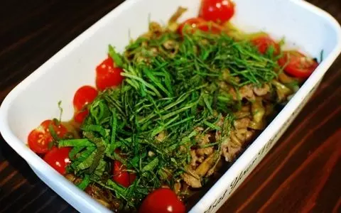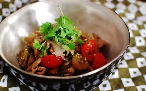 6.食べる直前に大葉を入れてよく混ぜる。冷たいままでも、温めても美味しい。仕上げにパクチーや白いりゴマを飾って完成です。