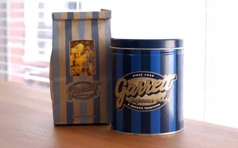 写真は、昨年原宿駅前にオープンしたギャレット ポップコーン ショップスの「シカゴ ミックス」! 左は袋詰めのSサイズ(390円・8%の消費税込)、右は缶入りのQuart(1,240円・8%の消費税込)です。