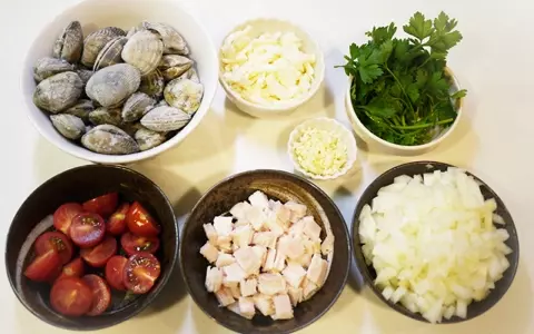 3. その他の材料を準備します。玉葱とニンニクはみじん切りに、ベーコンは1cm程度のさいの目切りに、ミニトマトは半分に切ります。パセリは食べやすい大きさに切ります。(イタリアンパセリが見栄えが良くお勧め)
