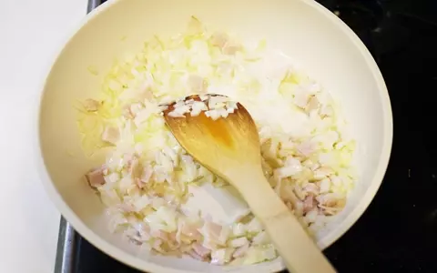 5. フライパンにバターとニンニクを入れて火をつけます。弱火で加熱して香りがでてきたら、ベーコンと玉葱を入れます。中弱火で玉葱がしんなりするまで炒めます。