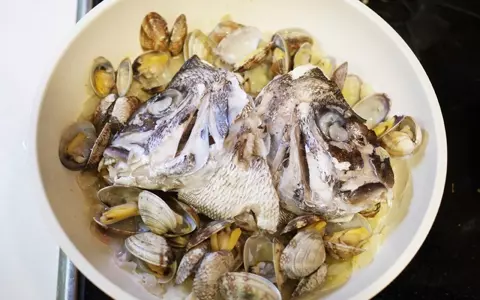 6. アサリ、鯛、白ワインを加えて蓋をします。弱火~中弱火でアサリの口が開くまで5分程加熱します。加熱が終わったら、別皿にアサリと鯛だけを取り出してラップをしておきます。