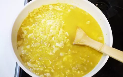 7. 同じフライパンに米とカレー粉を入れ、中弱火で炒めます。全体的に馴染んだら、水とチーズを入れて混ぜます。