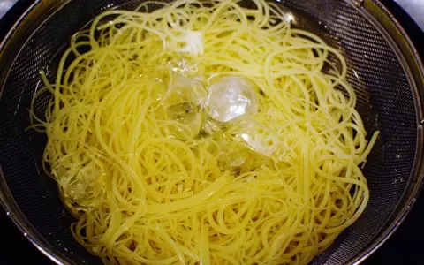 2.パスタは塩をいつもより多めに入れた湯で表示時間通りに茹で、冷水にとって粗熱がとれたら氷水をはったボウルに入れてよくしめる。