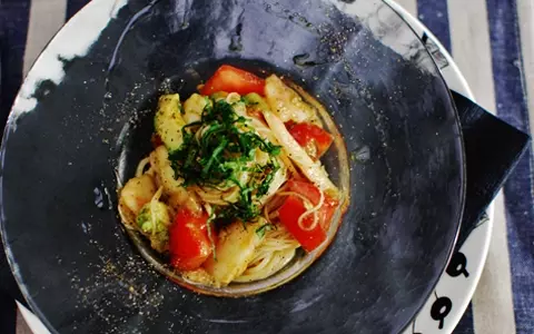 驚き桃の木の絶品レシピ! トマトと桃の冷製カッペリーニ