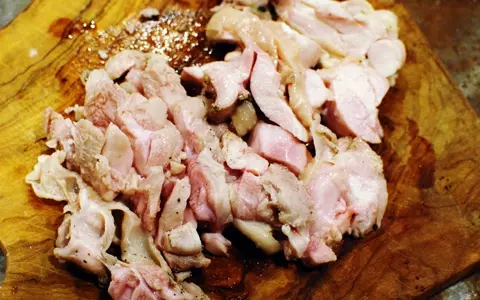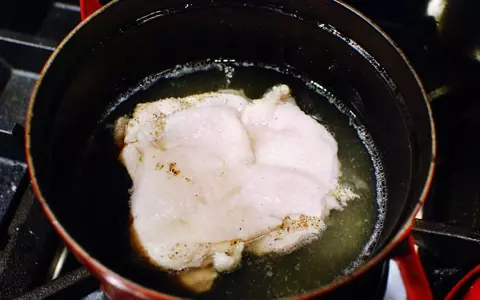2. 鍋に鶏肉がしっかり浸かるくらいの水と酒(1:1)を入れ、強火にかける。沸騰したら鶏肉をいれ、5秒ほどそのまま火にかけからすぐ蓋をして火を止めて35分~ほど置く※35分で一度取り出してみて、手で中心まで開いてみてまだ中心が生だったら戻して10分ほど置く。