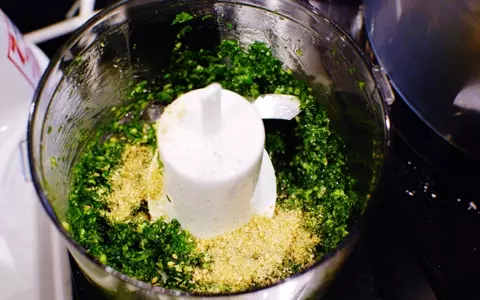 4. フードプロセッサーに★を入れ、細かくなるまで撹拌する。さらに白ごまをいれ撹拌する。