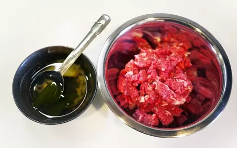 1. それでは早速作ってみよう。まず、ご飯の準備をします。水の量は通常よりも少なめに設定して炊きます。ご飯を炊いている間にその他の準備をします。寿司酢の調味料をよく混ぜ溶かし、小さく切った乾燥昆布を浸しておきます。使用する牛肉は塊でなければ細切れでも切り落としでもOKです。食べやすいように細かく切っておきます。