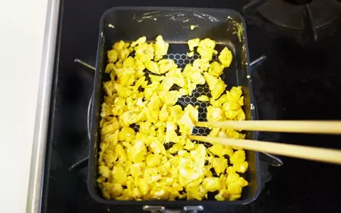 3. 次に胡麻入り卵を作ります。フライパンに胡麻油をしき、卵、塩、白胡麻を溶いた卵液を注ぎます。中弱火で加熱しながら箸でよく混ぜ、出来上がったら火を止めて別皿に取り出します。半熟加減はお好みでOK。お肉と大きさをある程度揃えるため、少し大きめの炒り卵にします。