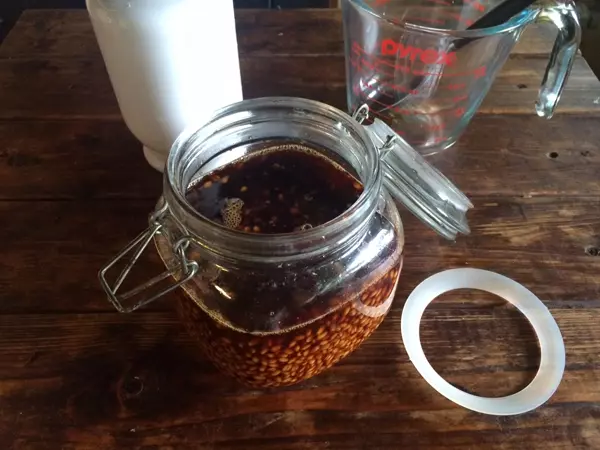 そして醤油をひたひたになるまで注ぎ、常温で1日1回混ぜると1週間ほどで完成します。