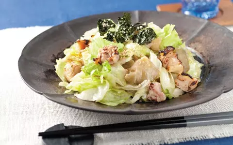 作り方はとっても簡単。電子レンジであたためて、串を取り外した炭火焼き鳥とザーサイ、カットレタスを、一番搾り純正ごま油であえ、味付のりをちぎって加えます。お皿に盛ったら、すりごまを散らして出来上がり。