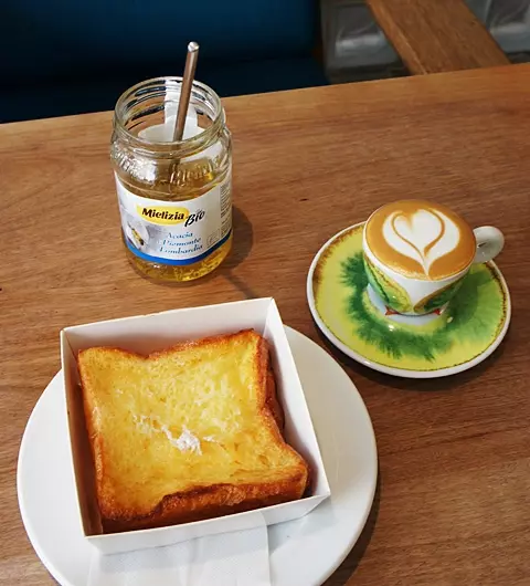 人気のフレンチトーストセットは700円。アパレイユにひと晩浸されたムーは程よい甘さで中はとろ~ん、好みではちみつをかけます。15時過ぎは、フライパンごと20分、オーブンで焼いた物が提供され、スフレのように膨らんでふわふわ、口の中でとろけるようです。モーニングはあらかじめ焼いてあったものを温めて出されますが、それでも満足できるおいしさです。