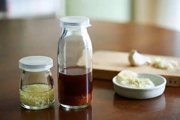 疲労回復、美肌効果など、さまざまな効用をもつニンニク。残ったニンニクはみじん切りにして小ビンに入れ、全体が漬かるくらいサラダ油を注ぎます。これで1カ月冷蔵保存可能なガーリックオイルが完成。イタリアンはもちろん、炒めもの全般に使えてとても便利です。便秘改善やむくみ予防、消化促進などの働きのあるショウガは、残った部分をすり下ろして、酢としょうゆ、みりんを加えます。ショウガ1〜2かけにつき、酢、しょうゆ、みりん各大さじ1が目安の分量で、2〜3カ月冷蔵保存で使える調味料になります。そのまま冷奴や海草類にかけてもいいし、ショウガ焼きのタレにも使えます。