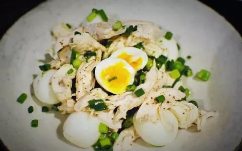 レモン汁は瓶などのものではなく、必ずフレッシュな直搾りでいきましょう。味が全然違います。余熱で火を通したしっとり鶏肉に、半熟のうずら卵。一緒に食べれば口の中でとろけるおいしさ!