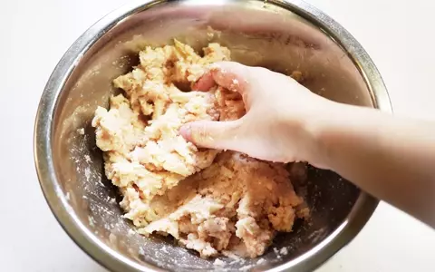 2. 油で揚げないため、今回は鶏もも肉の挽肉がおすすめです。パン粉は生パン粉でもドライパン粉でもどちらでもOKです。ドライタイプを使用する場合は分量外の牛乳または水を少量加えて、予め湿らせておきます。ニンニクとヤゲン軟骨はみじん切りにします。そこに、挽肉、ニンニク、塩、マヨネーズ、片栗粉、胡椒、ナツメグ、パン粉を加えて、粘り気が出るまでよく練り混ぜます。