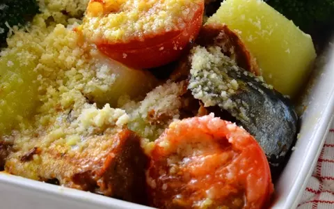 3.耐熱容器に1を入れて2を回しかけ、パルメザンチーズを全体にかけます。温めておいたオーブントースターで約5分、チーズに焼き色がつくまで焼きます。