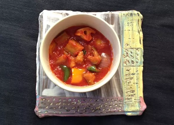 ひと口大に切ったナス、ピーマン、玉ねぎやレンコンなどの根菜、トマトをお好みのハーブとワインで煮込む。