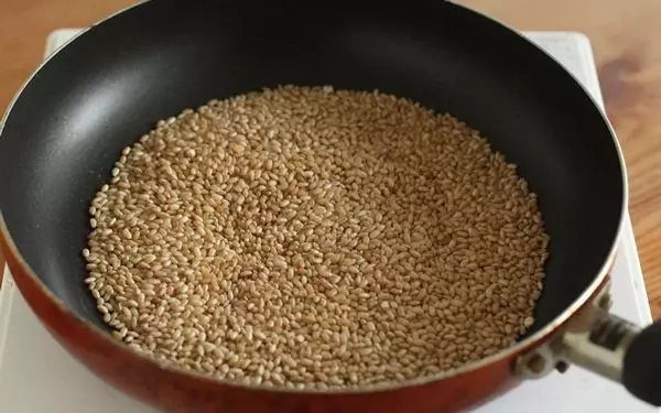 4.フライパンに玄米を入れて中火にかけ、中に火が通るまで15分ほど炒る。