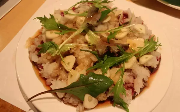 シカ肉のタタキの上に、にんにくと大根おろし、そしてポン酢がかかっています。とってもやわらかい~! シカ肉は鉄分豊富で、抗癌作用や免疫力を高める作用もあるそうですよ。