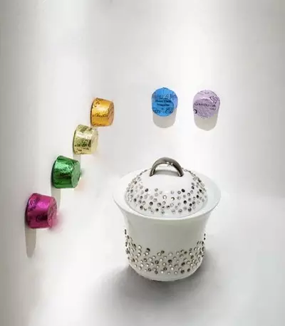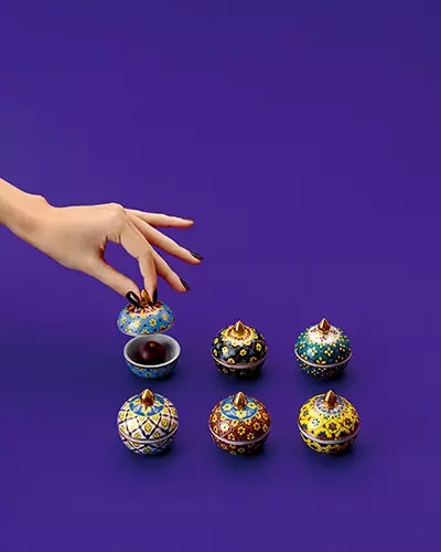 ひとつひとつハンドペイントされたタイ伝統のベンジャロン焼きに、南国ならではのフレーバー(パッションフルーツダーク/マンゴーミルク)のオリジナルトリュフチョコレートを入れた贅沢な1品。数量限定で登場するプレミアムなアイテムは銀座三越限定 全6色 1粒入 各1,800円(税込 1,944円)*銀座三越限定/ガロタイ