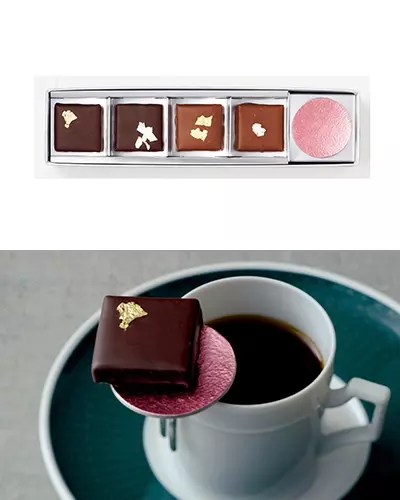 フレデリック・カッセル氏が日本のぶどう山椒の香りにインスパイアされて生み出した極上ショコラ「パルファン・ド・サンショウ」に、日本の伝統的な鋳造技術を継承する〈能作〉が作る錫製のテーブルアクセサリー「カプリス」をセットにした特別なアイテム。 4粒入+カプリス 5,000円(税込 5,400円/フレデリック・カッセル