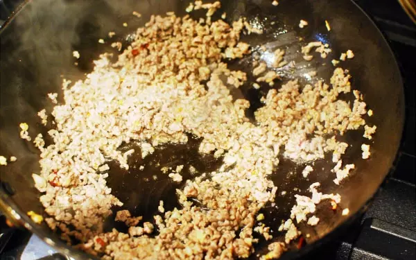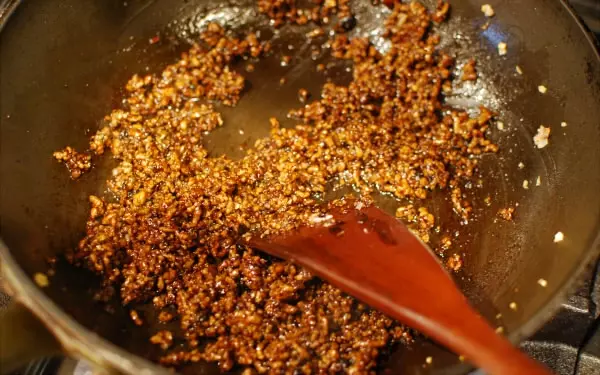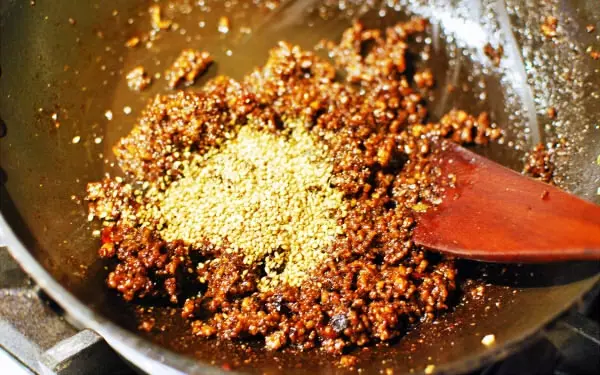 3.挽肉の色がほとんど変わったら1を入れて炒める。いい感じに煮詰まったら火を止め、花山椒を好みの量入れてよく混ぜる。※癖が強いので、初めて使う人は少しづつ入れて調整してください