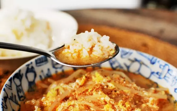 ごはんをスープに浸して~。ピリ辛だけど、だしの優しいスープが胃に染み渡る! あれ、だんだん二日酔いの気持ち悪いのが引いてきたかも?