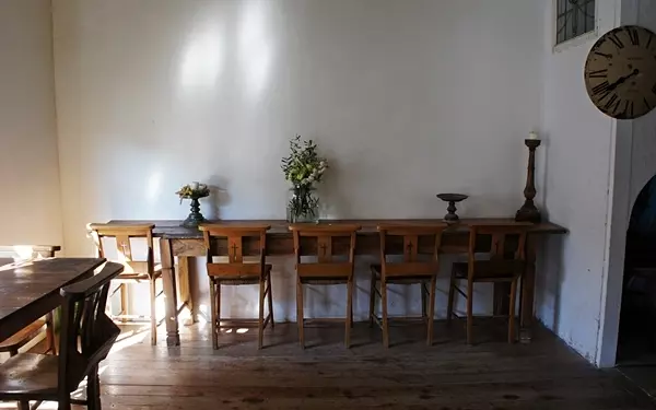 この光と影が創りだす美しい場所が朝の9時にはオープン。長テーブルに9席、テーブルが4卓、カウンターが5席と十分に席が用意されています。