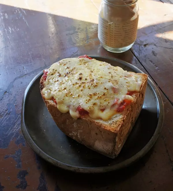 ブランチとしていただいたのは、店名でもあるラ・ヴィ・ア・ラ・カンパーニュ、ダイナミックに半斤分の食パンを使ったピザトーストで、他にはひよこ豆と野菜のスープとグラタン、チキンとポテトのバルサミコ煮がありました。田舎風のどっしりとした食パンをくり抜いた中には、ラタトゥーユとたっぷりのチーズ、ナイフを入れると湯気が上がりました。