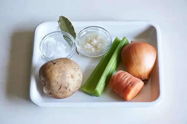 その日の冷蔵庫にあるもので作るので、少しも特別なスープではありません。味や色、濃さもその時々で変わりますし、忙しい朝なので材料も作り方もシンプルです。コツといえば“ていねいに作ること”でしょうか。野菜の美味しさをストレートに味わえるトロトロのポタージュを飲んで、一日を元気に明るくスタートさせませんか?残り野菜を活用!栄養たっぷり 野菜ポタージュレシピここでリメイクレシピのご紹介。まず用意する道具は、お鍋&蓋。蓋をして“蒸し炒め”するため、厚手のお鍋がオススメです。そしてミキサーを使って、滑らかな口当たりに仕上げます。ベースとなる玉ねぎをはじめ野菜や調味料、オイルなどは、なるべくいいものを選びましょう。【材料】(2〜3皿分)じゃがいも、セロリの茎、人参、玉ねぎ、ローリエ1枚ココナッツオイル(またはオリーブオイル) 大さじ1/2くらい塩麹大さじ1/2(または塩小さじ2/3)くらい