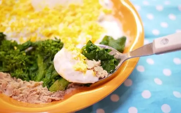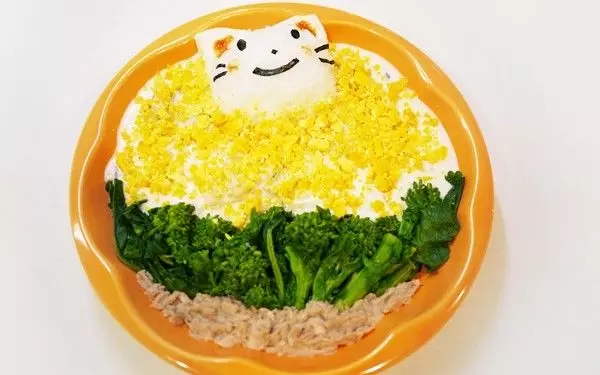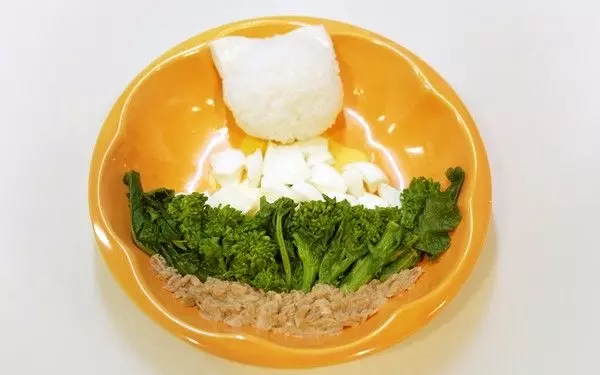 7.お皿に具をのせていきます。まずに白身を中央あたりに広げて、菜の花とツナをのせます。奥行きが少し感じられるように、境目は直線ではなく緩やかな曲線を意識するのがポイント。その後、猫の頭を作ります。ラップでご飯を適量包み丸く形を作ったら、白身で作った耳をつけます。水で濡らした指でご飯の側面に凹を作ってから差し込み、隙間にご飯を少量足して整えます。頭は少し斜めに傾けて配置すると可愛さがアップします。