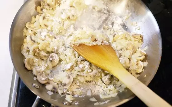 5.同じフライパンにバターとニンニクを入れ、弱火で炒めて香りを出します。香りがしっかり出てきたら、玉葱とマッシュルームも入れて炒めます。火加減は弱火~中弱火。玉葱に火が通って軟らかくなったら、小麦粉を3回くらいに分けて加え、弱火で炒めます。(小麦粉は火が強いと焦げやすいので注意)