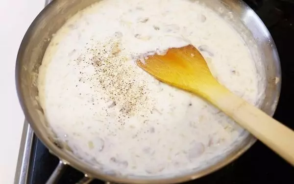 牛乳が馴染んだら、塩胡椒で味をつけます。塩の分量は今回の量で小さじ2~2.5杯程度が目安です。味見をしながら加えて下さい。※牛乳は沸騰すると分離しやすいため、弱火でトロミがでるまで加熱し、沸騰手前で止めるようにします。トロミは後から出てくるので、最初はゆるめで大丈夫。