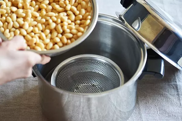 蓋をして強火にかけ、蒸気が出てきたら弱火にして約1時間蒸せば、できあがりです。圧力鍋の場合は、蓋をして強火にかけ、蒸気が出始めてから5分加熱し、火を止めて10分蒸らせば完成です。蓋を開けるとフワッ〜とした蒸気とともにツヤツヤの大豆がお目見え。ほっこり幸せな気分になれます。