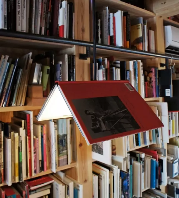 洋書を使って作ったライトは「写真集食堂 めぐたま」オリジナル、遊び心があります。
