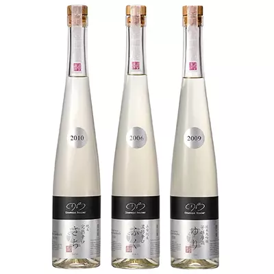 ドミニク・ブシェ氏とのコラボシリーズ。左から「純米完熟辛口さち」370ml ¥1,500、「山廃純米濃醇辛口ふく」370ml ¥2,000、「純米大吟醸芳醇原酒ゆり」370ml ¥2,500 (すべて税抜)