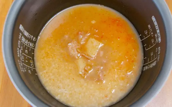 2.炊飯器に米とレトルトカレー、塩を加えて2合の線まで硬水を入れて炊く。