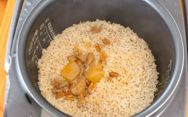 いかがでしょうか。簡単ですね。レトルトのマッサマンカレー1パックだと米は1合と半分くらいが適量です。今回は2合なのでちょっと味が薄めです。そのため、塩を少々足してます。炊きあがりはこんな感じです。