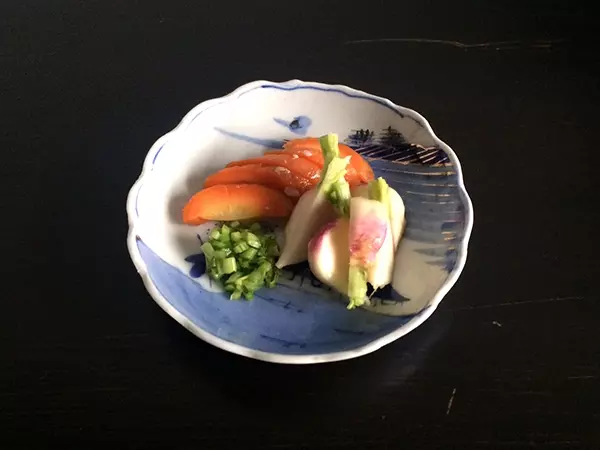 「三五八漬け」は江戸時代から伝わるお漬け物の1つで、塩、米麹、米を3:5:8の割合で合わせた漬け床に漬けることから、そう呼ばれています。糀が熟成し、乳酸が作られることで、若干ぬか漬けの風味を感じますが、ぬか漬けよりも甘みがあるお漬け物です。